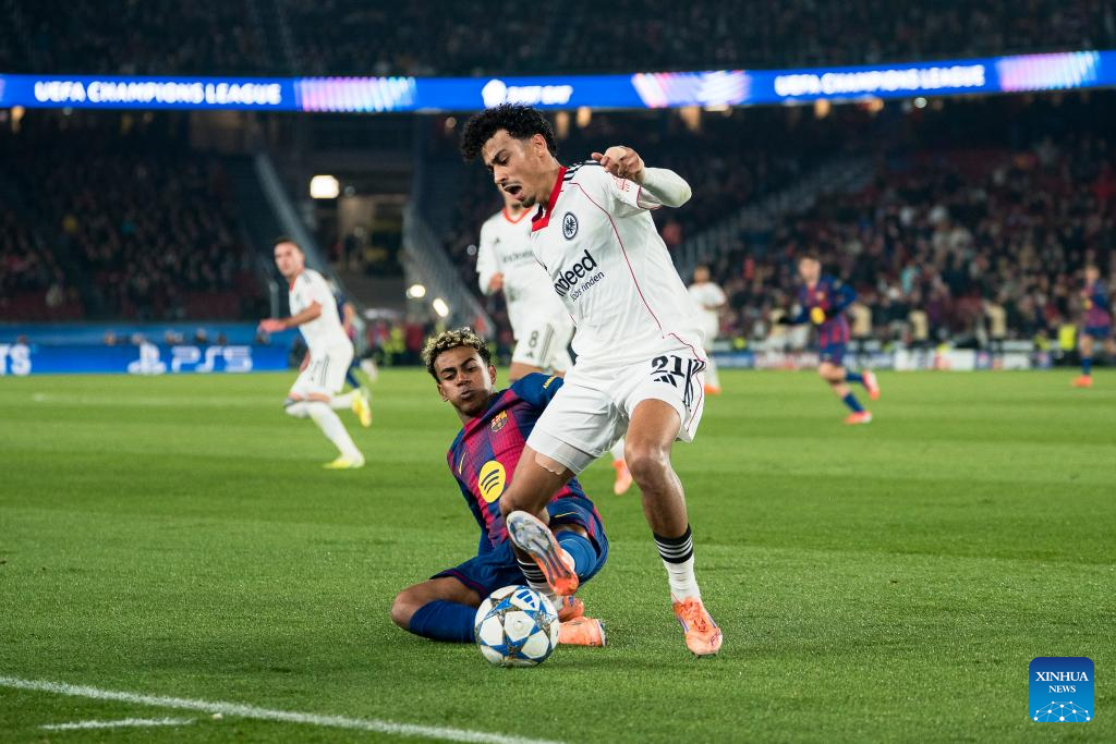 FC Barcelona's Lamine Yamal (L, front) vies with Eintracht Frankfurt's Nathaniel Brown (R, front) during the UEFA Champions League football match between FC Barcelona and Eintracht Frankfurt in Barcelona, Spain, Dec. 9, 2025. (Photo by Joan Gosa/Xinhua)