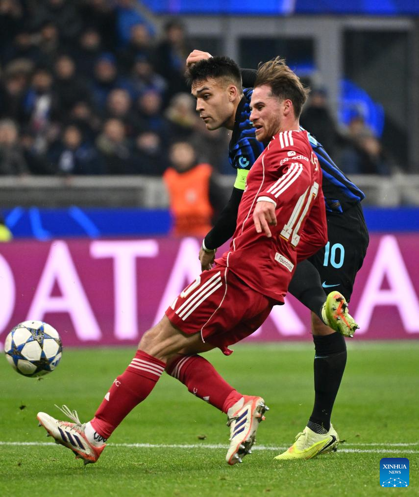 Inter Milan's Lautaro Martinez (R) vies with Liverpool's Alexis Mac Allister during the UEFA Champions League between Inter Milan and Liverpool in Milan, Italy, Dec. 9, 2025. (Photo by Alberto Lingria/Xinhua)