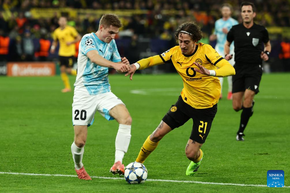 Fabio Silva (R) of Borussia Dortmund vies with Fredrik Sjovold of Bodo/Glimt during the UEFA Champions League football match between Borussia Dortmund and Bodo/Glimt in Dortmund, Germany, Dec. 10, 2025. (Photo by Joachim Bywaletz/Xinhua)
