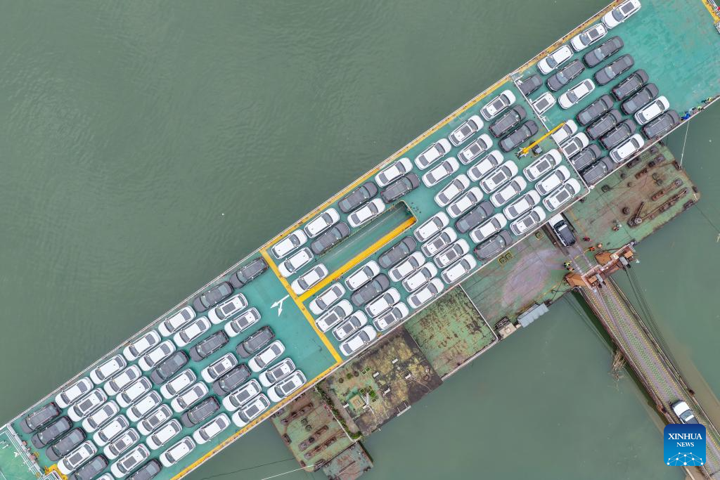 A drone photo taken on Dec. 5, 2025 shows export-bound new energy vehicles being loaded onto a shipping vessel at a dock in Chongqing, southwest China. (Xinhua/Huang Wei)