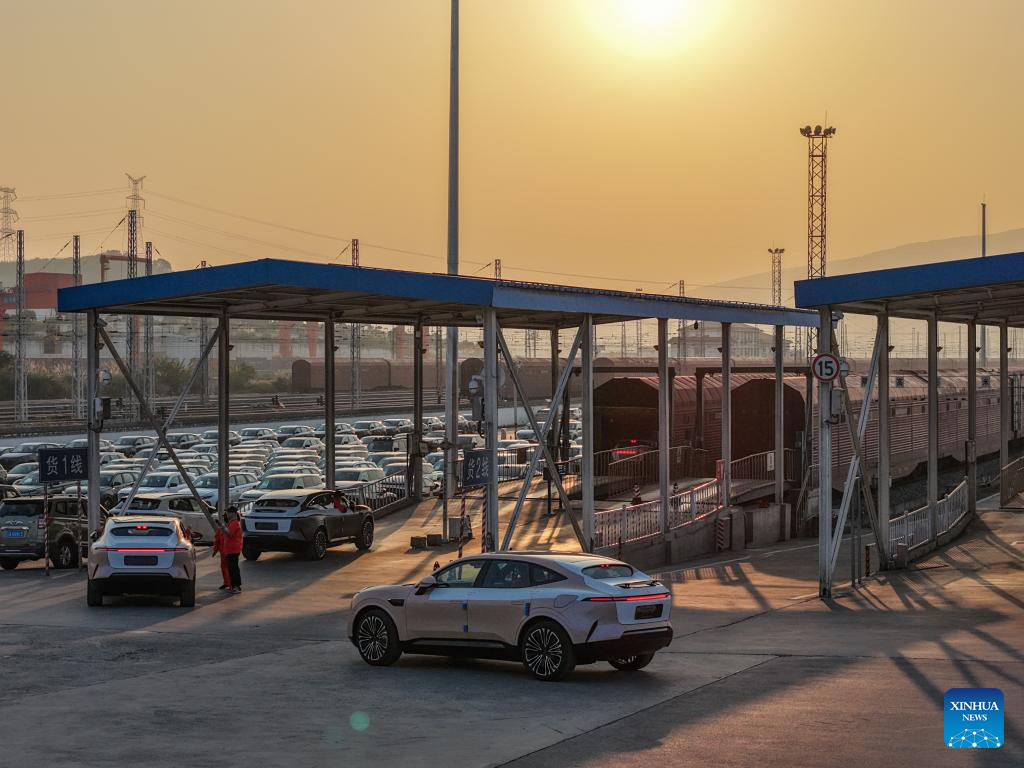 A drone photo taken on Nov. 29, 2025 shows export-bound new energy vehicles made in Chongqing being driven to a cargo train at a commercial vehicle logistics base in Chongqing, southwest China. (Xinhua/Huang Wei)