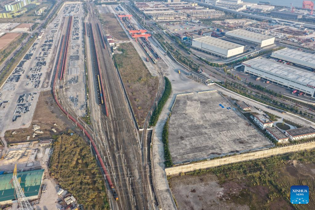 An aerial drone photo taken on Nov. 29, 2025 shows a cargo train loaded with export-bound new energy vehicles made in Chongqing departing a commercial vehicle logistics base in Chongqing, southwest China. (Xinhua/Huang Wei)