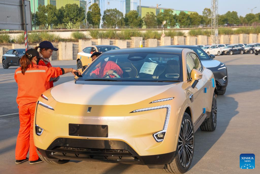 Workers keep record of an export-bound new energy vehicle made in Chongqing at a commercial vehicle logistics base in Chongqing, southwest China, Nov. 29, 2025. (Xinhua/Huang Wei)