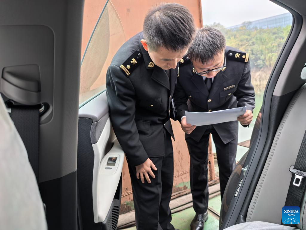 Staff members of the Chongqing Customs check export-bound new energy vehicles at a port in Chongqing, southwest China, Dec. 5, 2025. (Photo by Luo Zhiwen/Xinhua)