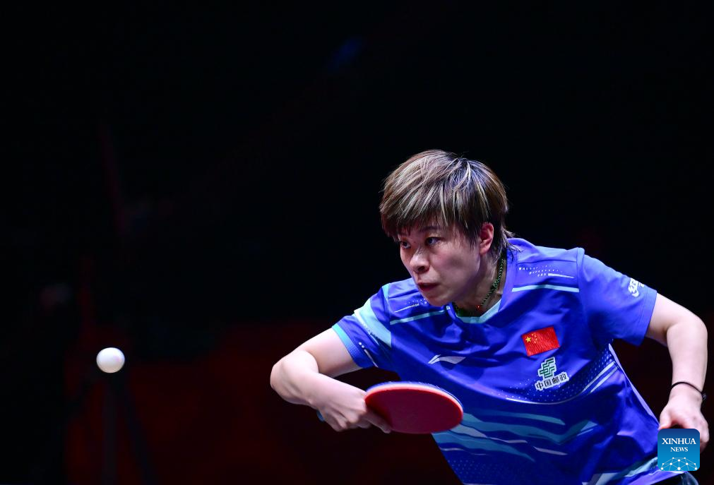 Wang Yidi competes during the women's singles round of 16 match between Sun Yingsha of China and Wang Yidi of China at the WTT Finals Hong Kong 2025 in Hong Kong, south China, Dec. 11, 2025. (Xinhua/Chen Duo)