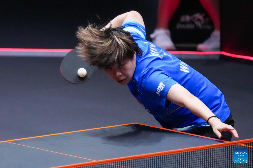 Wang Yidi competes during the women's singles round of 16 match between Sun Yingsha of China and Wang Yidi of China at the WTT Finals Hong Kong 2025 in Hong Kong, south China, Dec. 11, 2025. (Xinhua/Zhu Wei)
