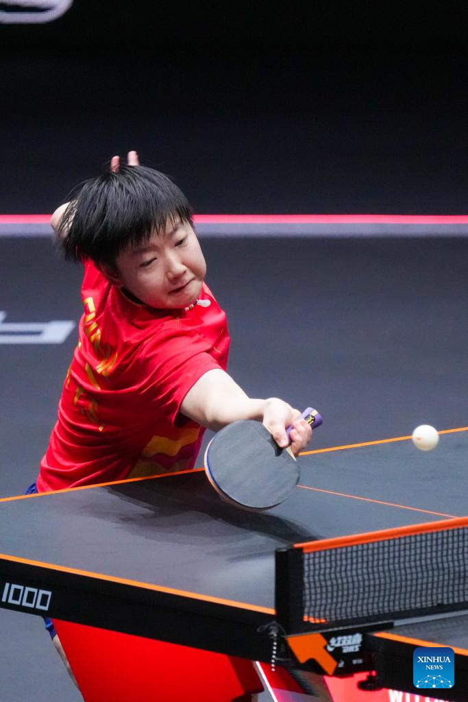 Sun Yingsha competes during the women's singles round of 16 match between Sun Yingsha of China and Wang Yidi of China at the WTT Finals Hong Kong 2025 in Hong Kong, south China, Dec. 11, 2025. (Xinhua/Zhu Wei)