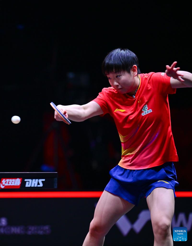 Sun Yingsha competes during the women's singles round of 16 match between Sun Yingsha of China and Wang Yidi of China at the WTT Finals Hong Kong 2025 in Hong Kong, south China, Dec. 11, 2025. (Xinhua/Chen Duo)