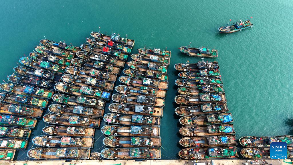 An aerial drone photo shows fishing boats berthed at Jimiya fishing port in Xihai'an (West Coast) New Area in Qingdao, east China's Shandong Province, Dec. 11, 2025.