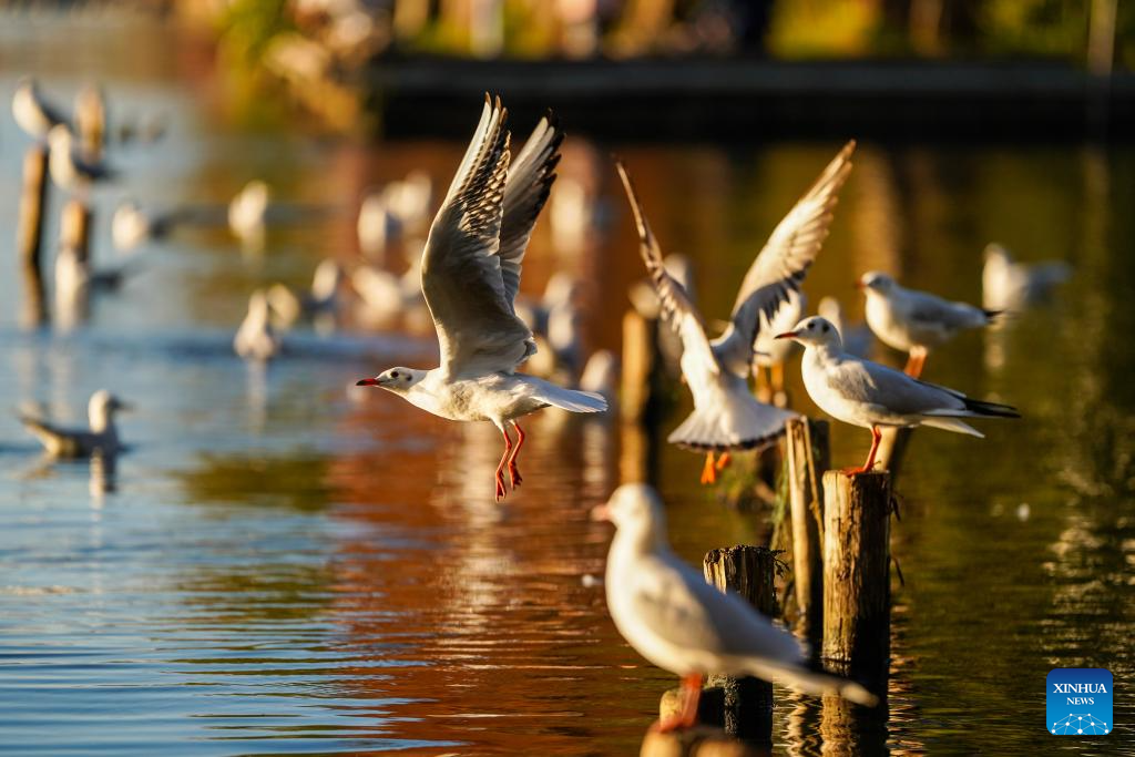 Black-headed gulls are pictured at a wetland park by the Dianchi Lake in Kunming, southwest China's Yunnan Province, on Dec. 10, 2025. (Xinhua/Peng Yikai)