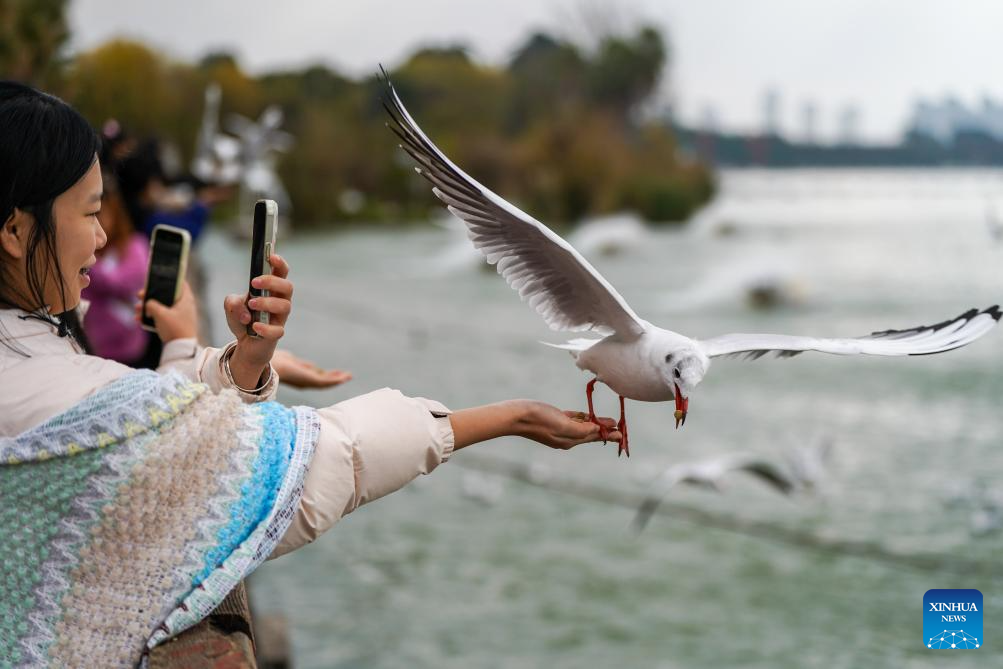A tourist feeds black-headed gulls at the Haigeng east pier by the Dianchi Lake in Kunming, southwest China's Yunnan Province, on Dec. 11, 2025. (Xinhua/Peng Yikai)