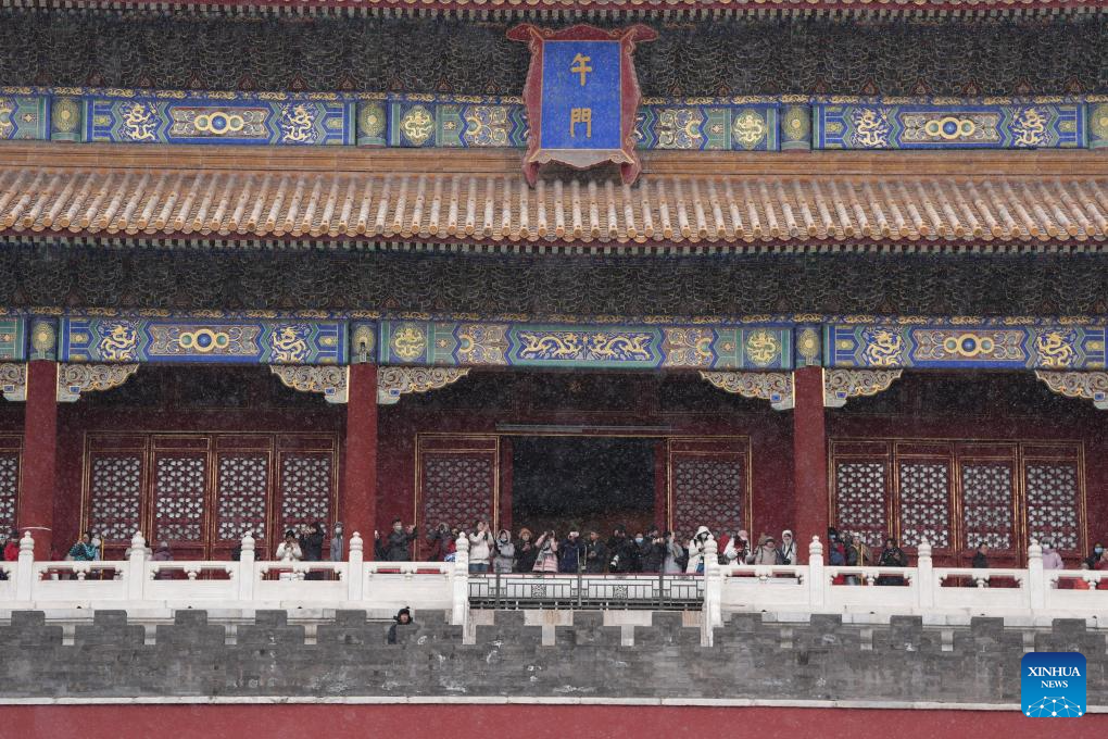 Tourists visit the Palace Museum amid snowfall in Beijing, capital of China, Dec. 12, 2025. Beijing witnessed its first significant snowfall of this winter season on Friday. (Xinhua/Ju Huanzong)