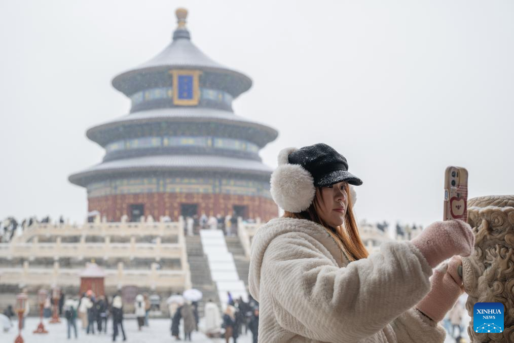 Tourists visit the Tiantan (Temple of Heaven) Park amid snowfall in Beijing, capital of China, Dec. 12, 2025. Beijing witnessed its first significant snowfall of this winter season on Friday. (Xinhua/Hu Jingwen)