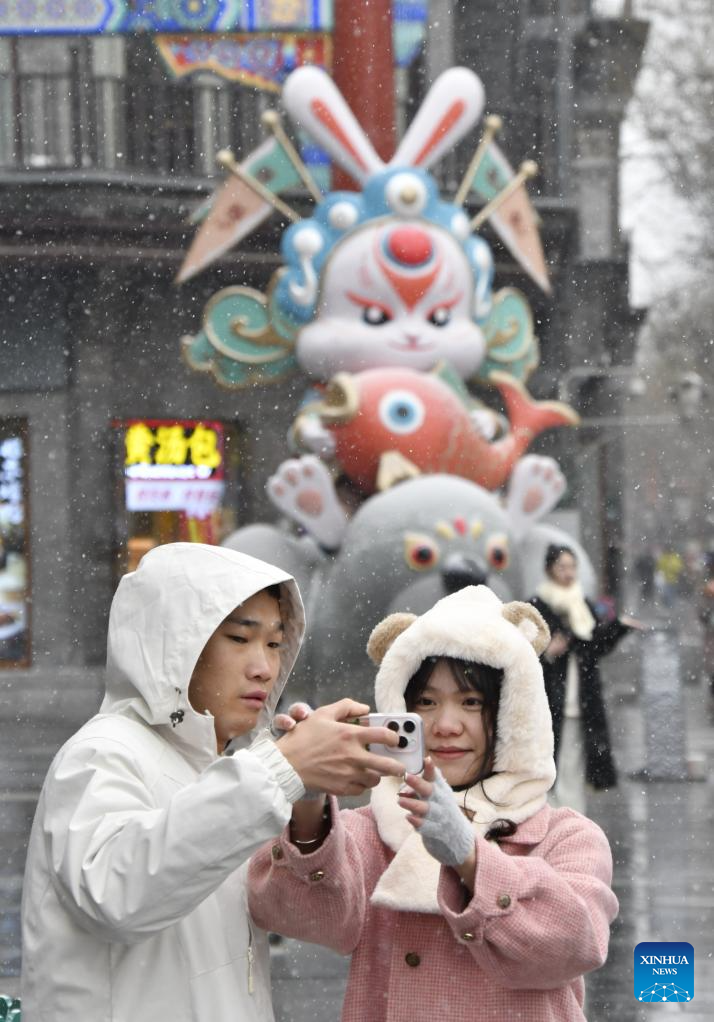 Tourists take photos at the Qianmen pedestrian street amid snowfall in Beijing, capital of China, Dec. 12, 2025. Beijing witnessed its first significant snowfall of this winter season on Friday. (Xinhua/Li Xin)