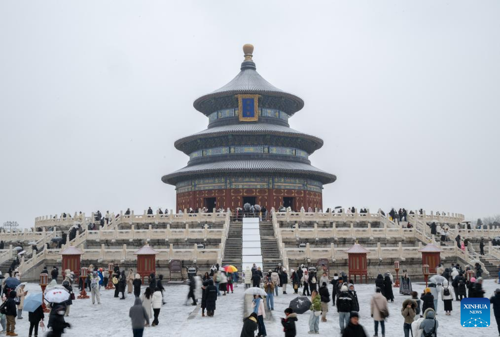 Tourists visit the Tiantan (Temple of Heaven) Park amid snowfall in Beijing, capital of China, Dec. 12, 2025. Beijing witnessed its first significant snowfall of this winter season on Friday. (Xinhua/Hu Jingwen)