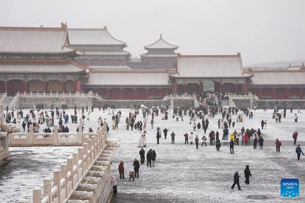 Tourists visit the Palace Museum amid snowfall in Beijing, capital of China, Dec. 12, 2025. Beijing witnessed its first significant snowfall of this winter season on Friday. (Xinhua/Ju Huanzong)