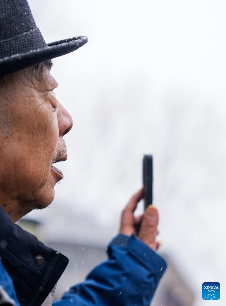 A resident shares the wintry scene with a friend on a video call amid snowfall in Beijing, capital of China, Dec. 12, 2025. Beijing witnessed its first significant snowfall of this winter season on Friday. (Xinhua/Bi Xiaoyang)