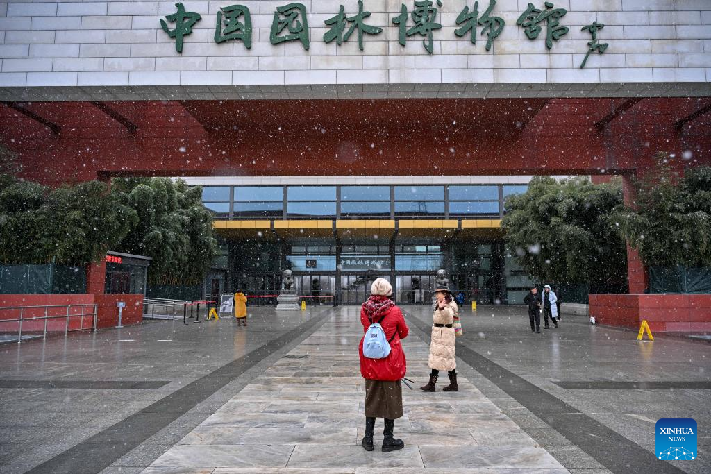 Tourists visit the Museum of Chinese Gardens and Landscape Architecture amid snowfall in Beijing, China, Dec. 12, 2025. Beijing witnessed its first significant snowfall of this winter season on Friday. (Xinhua/Zhang Cheng)