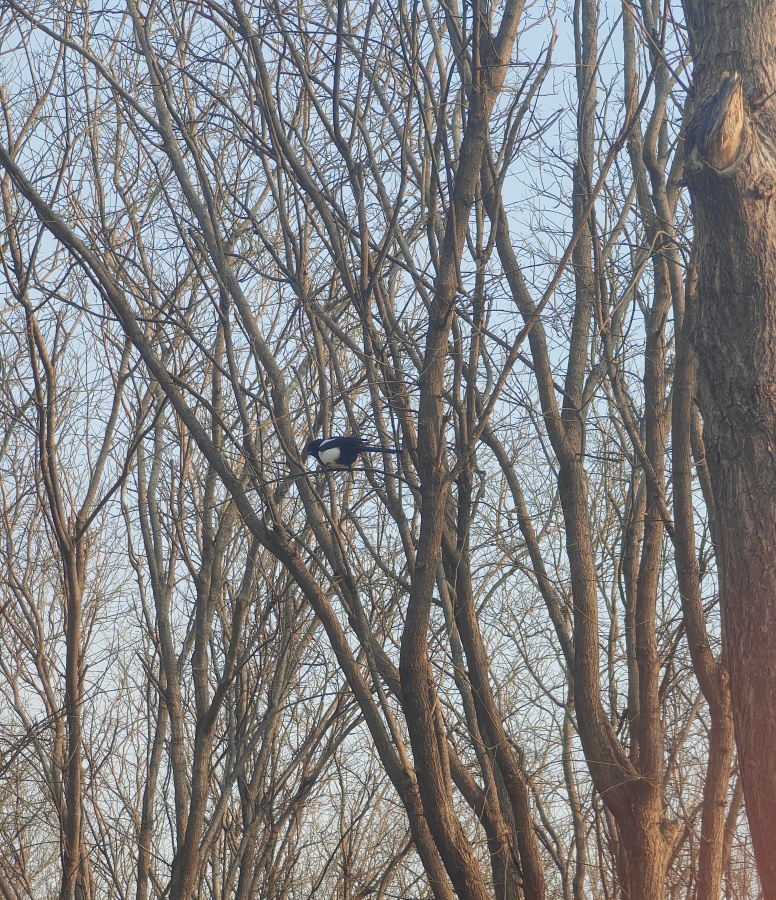A magpie perches among dense tree branches at Nanyuan Forest Wetland Park in Beijing, Dec. 11, 2025. [Photo by Liu Sitong/China.org.cn]