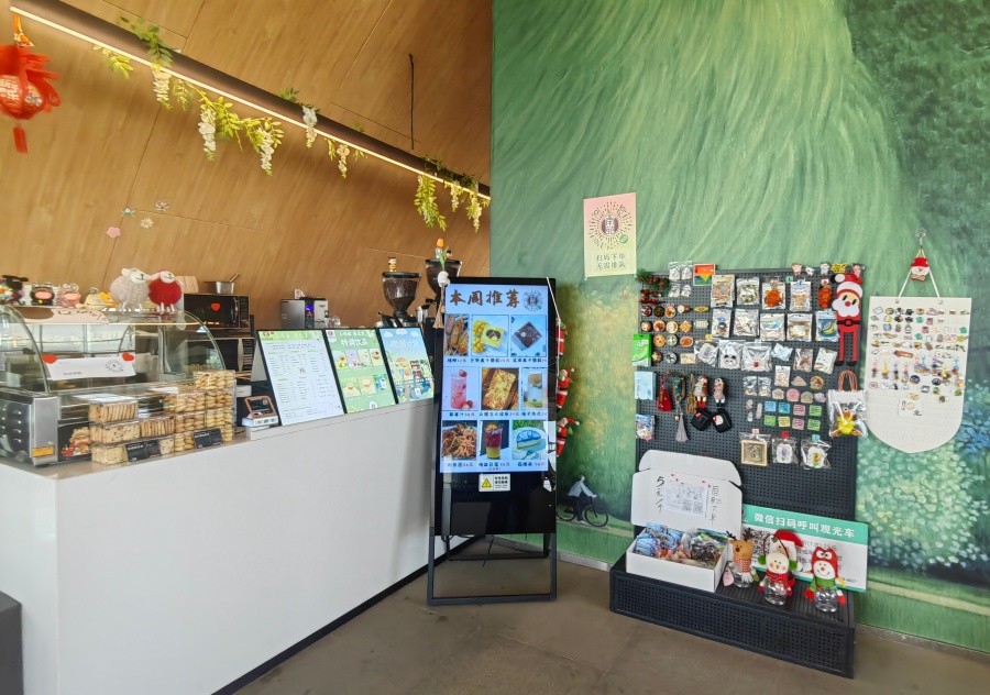 A shop selling food, drinks and cultural products at the viewing platform of Nanyuan Forest Wetland Park in Beijing, Dec. 11, 2025. [Photo by Liu Sitong/China.org.cn]