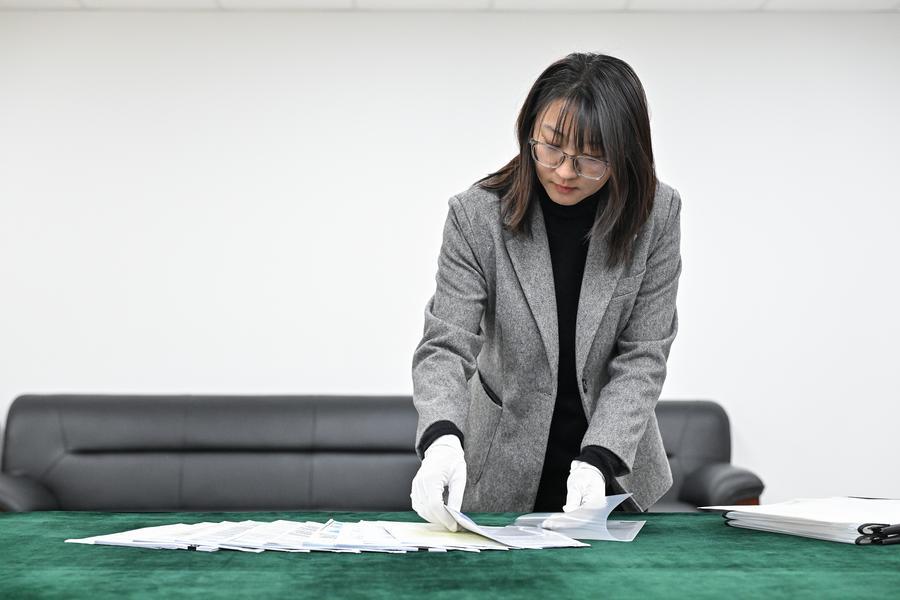 This undated photo shows a staff member from China's Central Archives arranging some Russian-provided archive copies related to the infamous Unit 731, a Japanese germ-warfare unit that operated during World War II. (Xinhua/Li Xin)