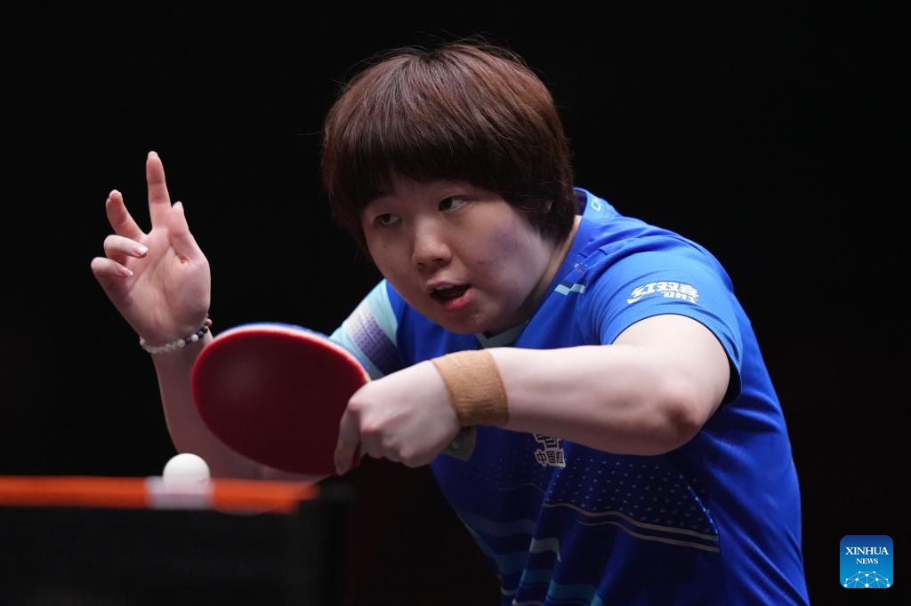 Kuai Man competes during the women's singles semifinal match between Sun Yingsha of China and Kuai Man of China at the WTT Finals Hong Kong 2025 in Hong Kong, south China, Dec. 13, 2025. (Xinhua/Lui Siu Wai)