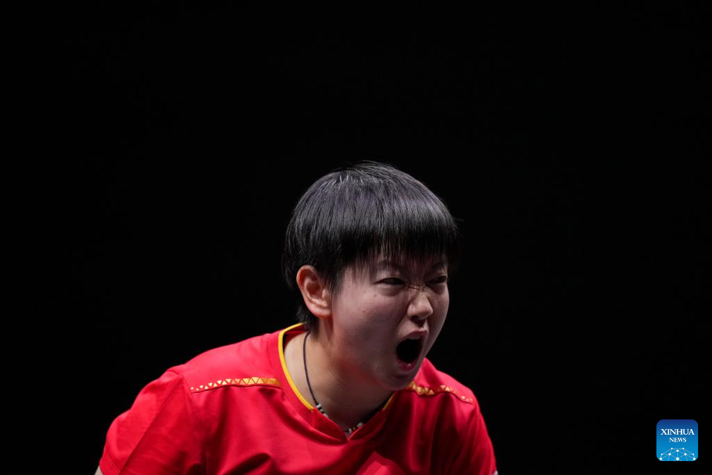 Sun Yingsha reacts during the women's singles semifinal match between Sun Yingsha of China and Kuai Man of China at the WTT Finals Hong Kong 2025 in Hong Kong, south China, Dec. 13, 2025. (Xinhua/Lui Siu Wai)