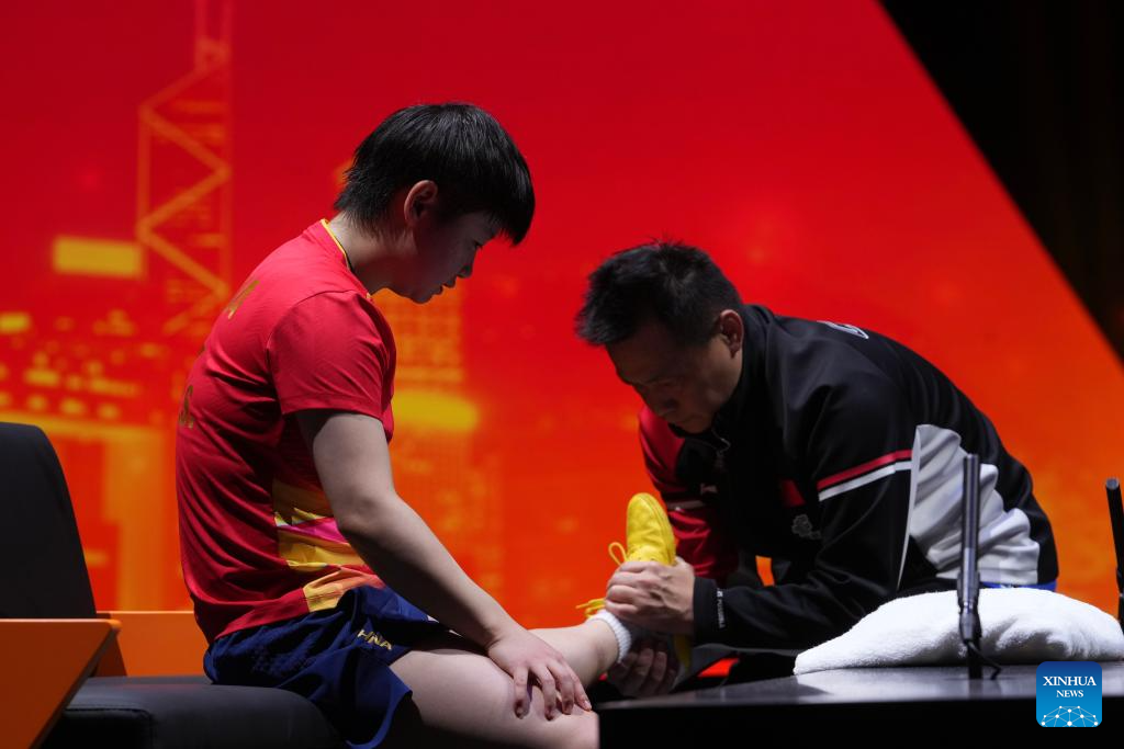 Sun Yingsha receives medical treatment during the women's singles semifinal match between Sun Yingsha of China and Kuai Man of China at the WTT Finals Hong Kong 2025 in Hong Kong, south China, Dec. 13, 2025. (Xinhua/Lui Siu Wai)