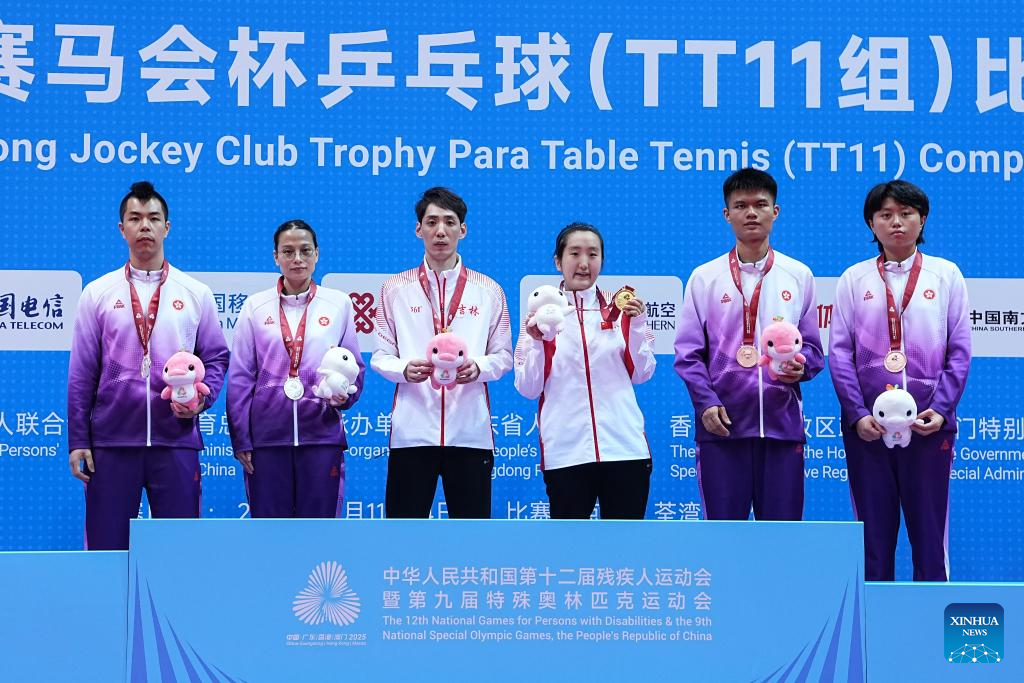 Gold medalists Wang Bo(3rd L)/Tang Yixin(3rd R) of Jilin, silver medalists Wan Wai Lok(1st L)/Wong Pui Kei (2nd L) of Hong Kong Team 1 and bronze medalists Yuen King Shing(2nd R)/Wong Ting Ting of Hong Kong Team 1 pose during the awarding ceremony of the mixed doubles category TT11 table tennis match at China's 12th National Games for Persons with Disabilities and the 9th National Special Olympic Games in Hong Kong, south China, Dec. 13, 2025. (Xinhua/Zhu Zheng)