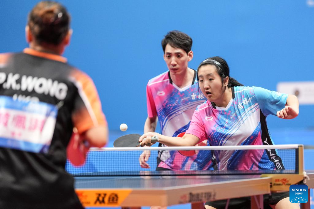 Wang Bo/Tang Yixin(R) of Jilin compete during the mixed doubles category TT11 table tennis match at China's 12th National Games for Persons with Disabilities and the 9th National Special Olympic Games in Hong Kong, south China, Dec. 13, 2025. (Xinhua/Zhu Zheng)
