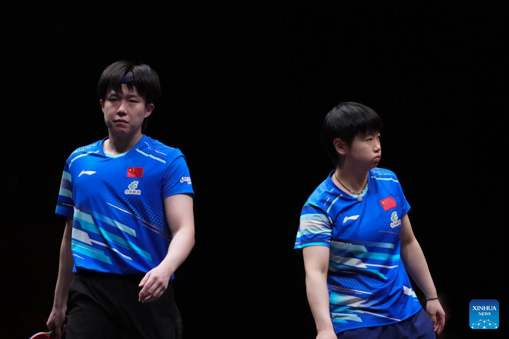 Wang Chuqin/Sun Yingsha (R) of China react during the mixed doubles final match between Wang Chuqin/Sun Yingsha of China and Lim Jonghoon/Shin Yubin of South Korea at the WTT Finals Hong Kong 2025 in Hong Kong, south China, Dec. 13, 2025. (Xinhua/Lui Siu Wai)