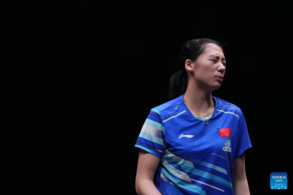 Chen Yi reacts during the women's singles semifinal match between Wang Manyu of China and Chen Yi of China at the WTT Finals Hong Kong 2025 in Hong Kong, south China, Dec. 13, 2025. (Xinhua/Lui Siu Wai)