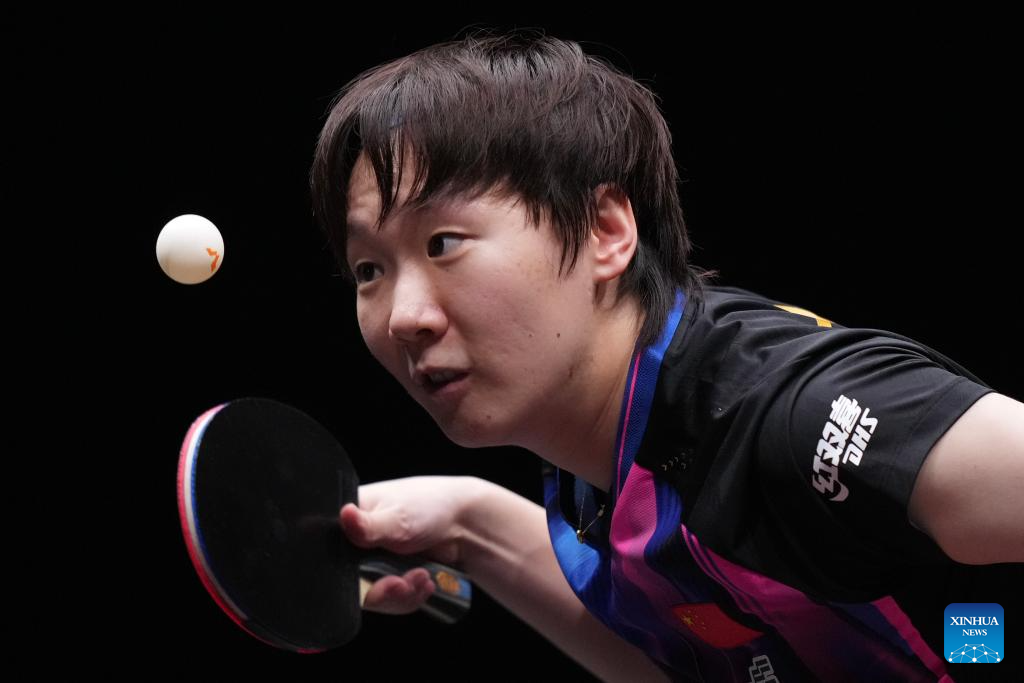 Wang Manyu competes during the women's singles semifinal match between Wang Manyu of China and Chen Yi of China at the WTT Finals Hong Kong 2025 in Hong Kong, south China, Dec. 13, 2025. (Xinhua/Lui Siu Wai)
