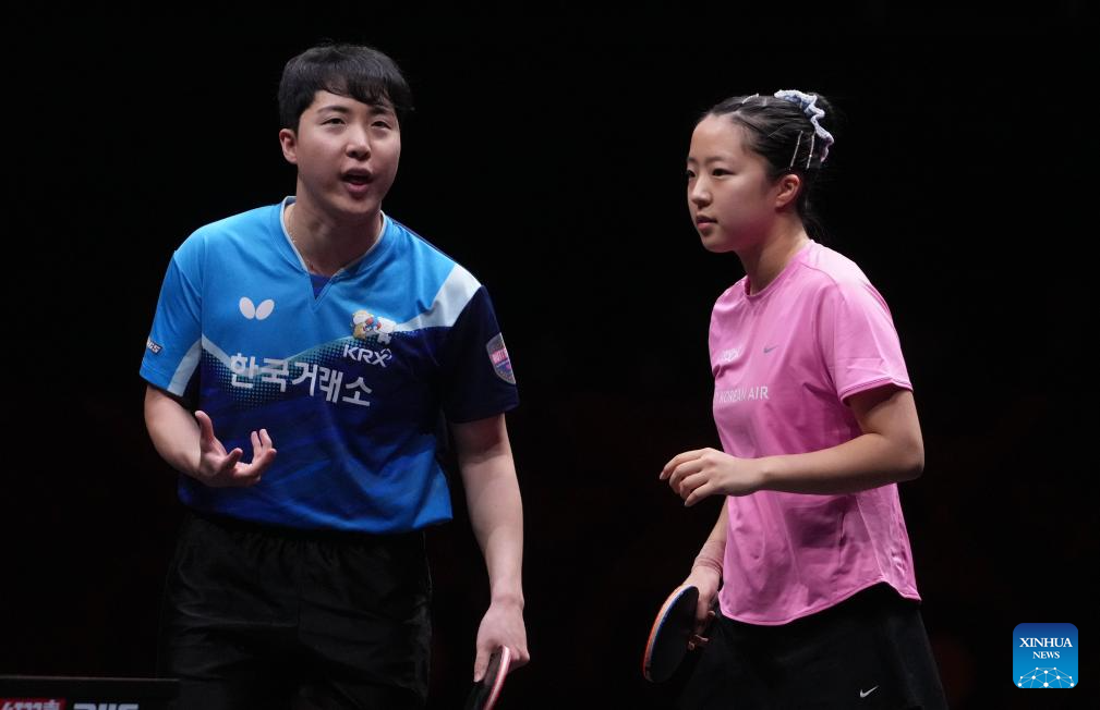 Lim Jonghoon/Shin Yubin (R) of South Korea react during the mixed doubles final match between Wang Chuqin/Sun Yingsha of China and Lim Jonghoon/Shin Yubin of South Korea at the WTT Finals Hong Kong 2025 in Hong Kong, south China, Dec. 13, 2025. (Xinhua/Lui Siu Wai)