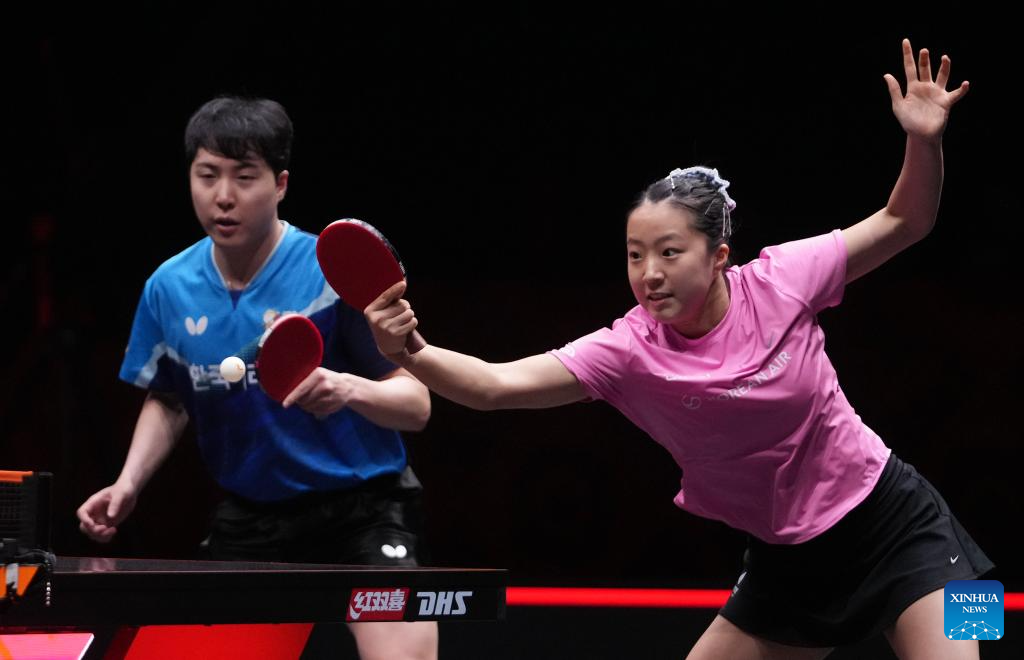 Lim Jonghoon/Shin Yubin (R) of South Korea compete during the mixed doubles final match between Wang Chuqin/Sun Yingsha of China and Lim Jonghoon/Shin Yubin of South Korea at the WTT Finals Hong Kong 2025 in Hong Kong, south China, Dec. 13, 2025. (Xinhua/Lui Siu Wai)