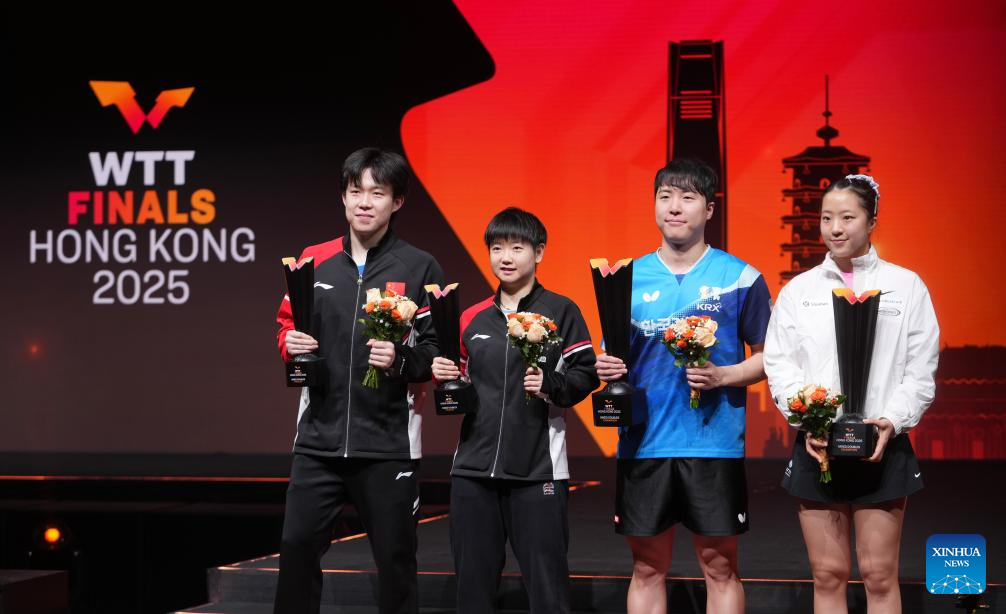 Lim Jonghoon (2nd R)/Shin Yubin (1st R) of South Korea and Wang Chuqin/Sun Yingsha (2nd L) of China pose at the awarding ceremony after the mixed doubles final match between Wang Chuqin/Sun Yingsha of China and Lim Jonghoon/Shin Yubin of South Korea at the WTT Finals Hong Kong 2025 in Hong Kong, south China, Dec. 13, 2025. (Xinhua/Lui Siu Wai)