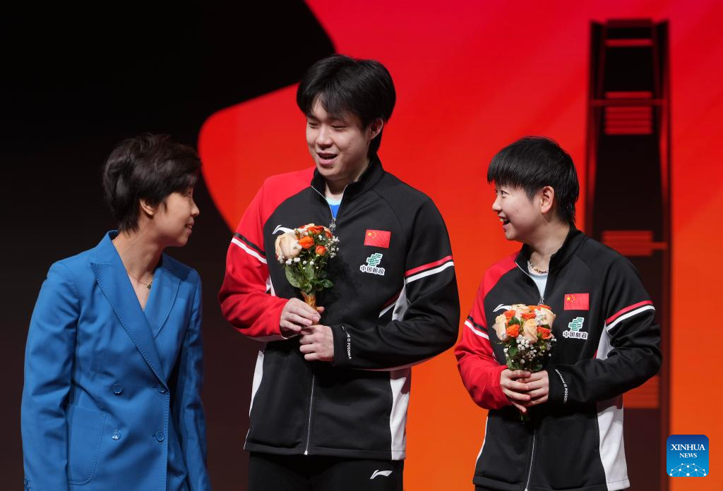 Award ceremony presenter Zhang Yining (L) communicates with Wang Chuqin/Sun Yingsha (R) of China after the mixed doubles final match between Wang Chuqin/Sun Yingsha of China and Lim Jonghoon/Shin Yubin of South Korea at the WTT Finals Hong Kong 2025 in Hong Kong, south China, Dec. 13, 2025. (Xinhua/Lui Siu Wai)