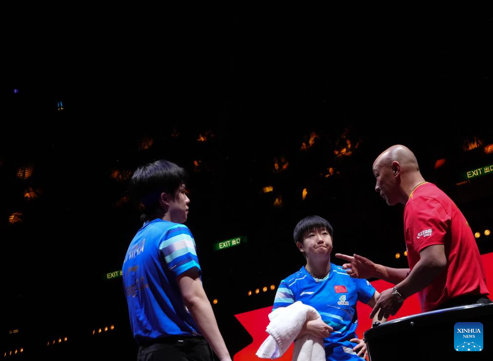 Coach Xiao Zhan (R) instructs Wang Chuqin/Sun Yingsha of China during the mixed doubles final match between Wang Chuqin/Sun Yingsha of China and Lim Jonghoon/Shin Yubin of South Korea at the WTT Finals Hong Kong 2025 in Hong Kong, south China, Dec. 13, 2025. (Xinhua/Lui Siu Wai)