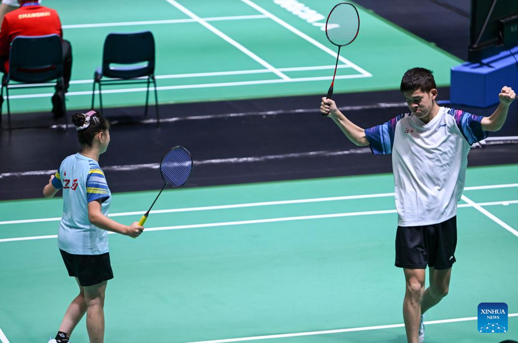 Hu Zhengfeng (R)/Cai Zihong of Jiangxi celebrate after age 16-21 group B mixed doubles badminton match at China's 12th National Games for Persons with Disabilities and the 9th National Special Olympic Games in Macao, south China, Dec. 13, 2025. (Xinhua/Zhao Zishuo)