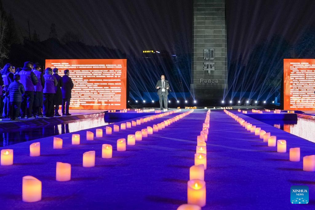 Christoph Reinhardt, the great-grandson of John Rabe, a German remembered for protecting hundreds of thousands of Chinese civilians during the Nanjing Massacre in 1937, speaks during a candle-light vigil at the Memorial Hall of the Victims in Nanjing Massacre by Japanese Invaders in Nanjing, capital of east China's Jiangsu Province, Dec. 13, 2025. A candle-light vigil was held at the memorial hall on Saturday, which was the 12th national memorial day for the victims of the Nanjing Massacre. (Xinhua/Li Bo)