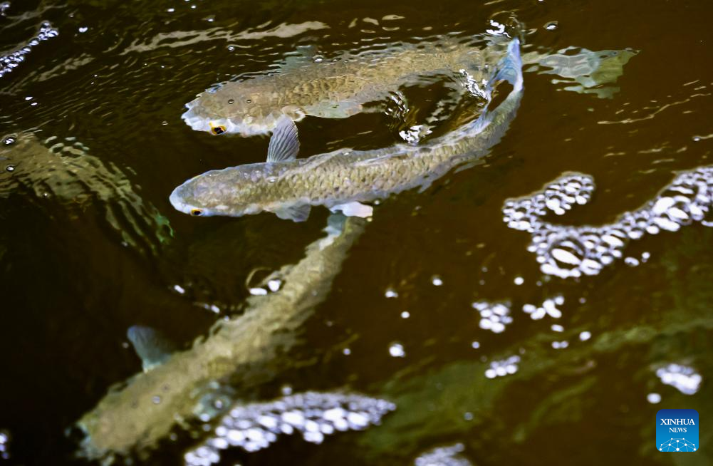 Yellownfin seabream are picutred at an aquaculture greenhouse in Helan County, Yinchuan, northwest China's Ningxia Hui Autonomous Region, Dec. 12, 2025. Helan County has been exploring the potential of aquaculture on its saline-alkali land in recent years. (Xinhua/Yang Zhisen)