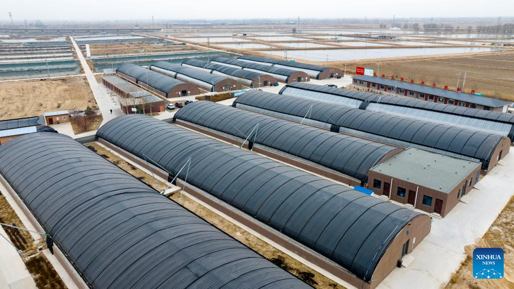 An aerial drone photo shows aquaculture greenhouses in Helan County, Yinchuan, northwest China's Ningxia Hui Autonomous Region, Dec. 12, 2025. Helan County has been exploring the potential of aquaculture on its saline-alkali land in recent years. (Xinhua/Yang Zhisen)