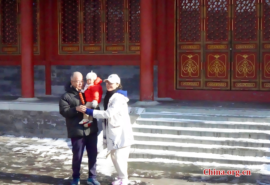 Grandparents take a photo with their grandchild, holding bingtanghulu (sugar coated hawthorn skewer) in hand at Prince Gong's Mansion Museum, Dec. 13, 2025. [Photo by Zhang Yuxin/China.org.cn]