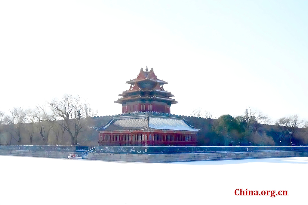 The Corner Tower of the Forbidden City and now frozen surrounding waters on Dec. 14, 2025. [Photo by Zhang Yuxin/China.org.cn]