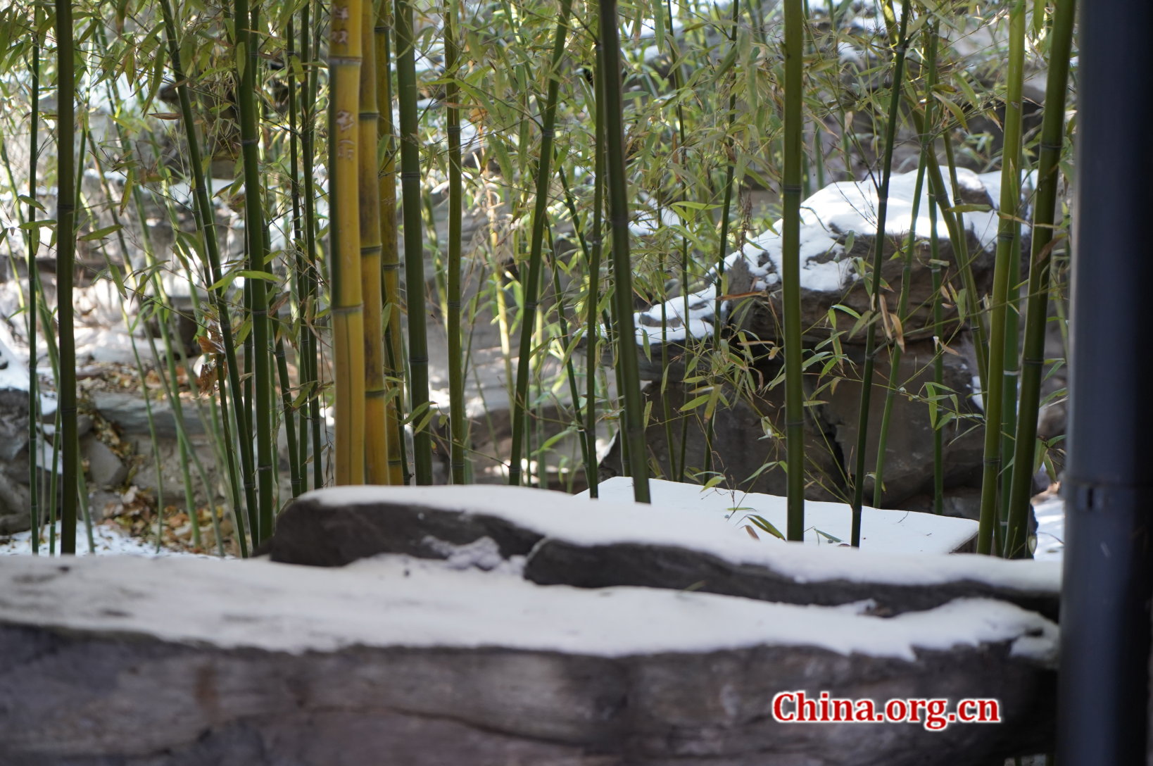 Snow-covered bamboo at Prince Gong's Mansion Museum on Dec. 13, 2025. [Photo by Zhang Yuxin/China.org.cn]