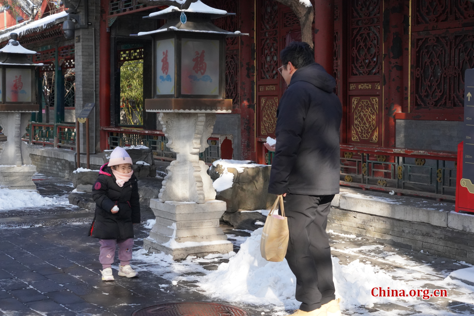 A child enjoys a snowball fight with her father at Prince Gong's Mansion Museum on Dec. 13, 2025. [Photo by Zhang Yuxin/China.org.cn]