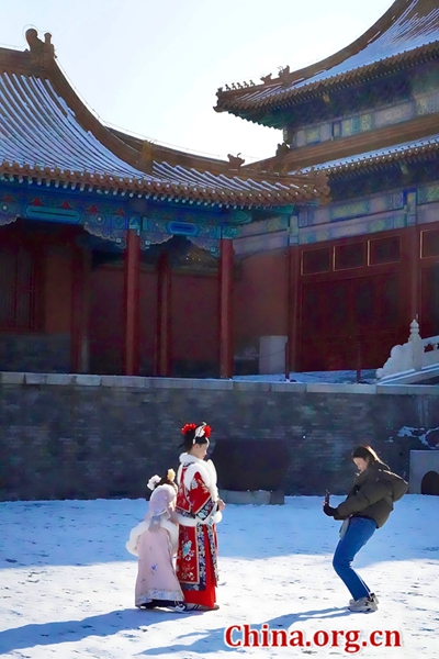 Mother and daughters 'freeze' a cherished moment at the Forbidden City, Dec. 14, 2025. [Photo by Zhang Yuxin/China.org.cn]