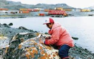 Lichen specialist Chen Jianbin is collecting samples near the Great Wall Station of China in the South Pole.