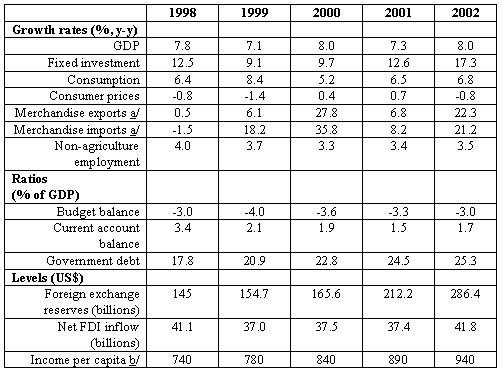 Among the major highlighted risks are those related to fiscal sustainability, continued growth in inequality (in particular rural distress), and an orderly transition to a market economy with an expanded role for the private sector. The government has renewed its commitment to tackling the toughest economic issues through appropriate policies and a reorganization of government functions, while recognizing the overall risk of attempting radical domestic reforms in the context of an inhospitable international economic environment. It has, therefore, projected a lower growth rate of 7 percent for 2003, and a growth rate of exports that is just one-third of the 2002 outcome.