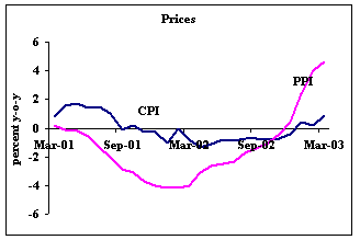 Another focus of attention in the industrial sector is the growth of China's exports of light manufactures and household goods in 2003, which the SARS epidemic centered on Guangdong and Hong Kong is likely to affect. The Pearl River economy accounts for nearly $90 billion of exports and 10 percent of the output of China. Therefore, the recent drop in business travel and purchaser-supplier activity, especially during the crucial April-June period when most business transactions in the contract-manufacturing regime are negotiated, is likely to have adverse effects. This comes on top of the squeeze on profitability in China's export-oriented industries that compete fiercely in a relatively slowly growing global market, especially the textile sector, which faces rising prices for cotton.
